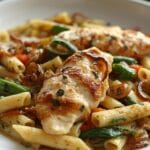 This Lemon Chicken Pasta Primavera with Balsamic Onions & Cream Sauce is a weeknight dinner dream come true. Imagine tender chicken and vibrant spring vegetables, all tossed in a rich, velvety cream sauce. But what truly sets this dish apart are the sweet, caramelized balsamic onions, adding a layer of sophisticated flavor that elevates every bite. This recipe delivers on both comfort and freshness, making it a perfect choice for a family meal or when you want something special without spending hours in the kitchen. It’s a complete skillet meal that comes together quickly, promising a delicious and satisfying experience.